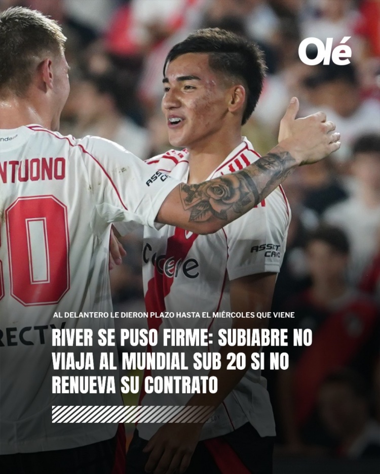 苏比亚布雷是唯一在阿根廷U20名单之中的河床球员,俱乐部给他的最后期限是下周三,目前谈判的主要分歧在于解约金,苏比亚布雷的团队希望解约金不超过3500万欧元,但河床方面立场强硬,要求所有青训球员的解约金都设定为1亿欧元,这是俱乐部现行的政策制度。