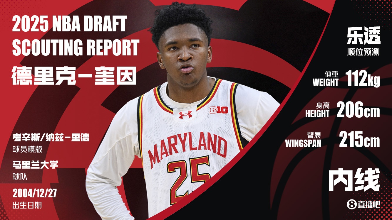 德里克-奎因身高(裸足)2米06,体重112公斤,臂展2米15。2024-25赛季(大一),奎因出战36场,场均30.4分钟,得到16.5分9篮板1.9助攻1.1盖帽1.1抢断,投篮命中率52.6%,三分命中率20%,罚球命中率76.6%。