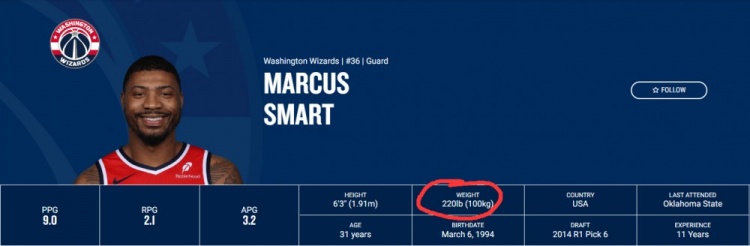 那么问题来了,斯玛特的体重到底是多少呢?根据官方的资料,斯玛特上赛季在奇才时是220磅(约100公斤),这和他在凯尔特人减重之后的体重相差无几,刚进联盟时斯玛特的体重为227磅,巅峰时更是达到240磅(108.86公斤),在2017年他因背伤和身体疲劳减重20磅,此后就一直维持在220磅左右的水平。