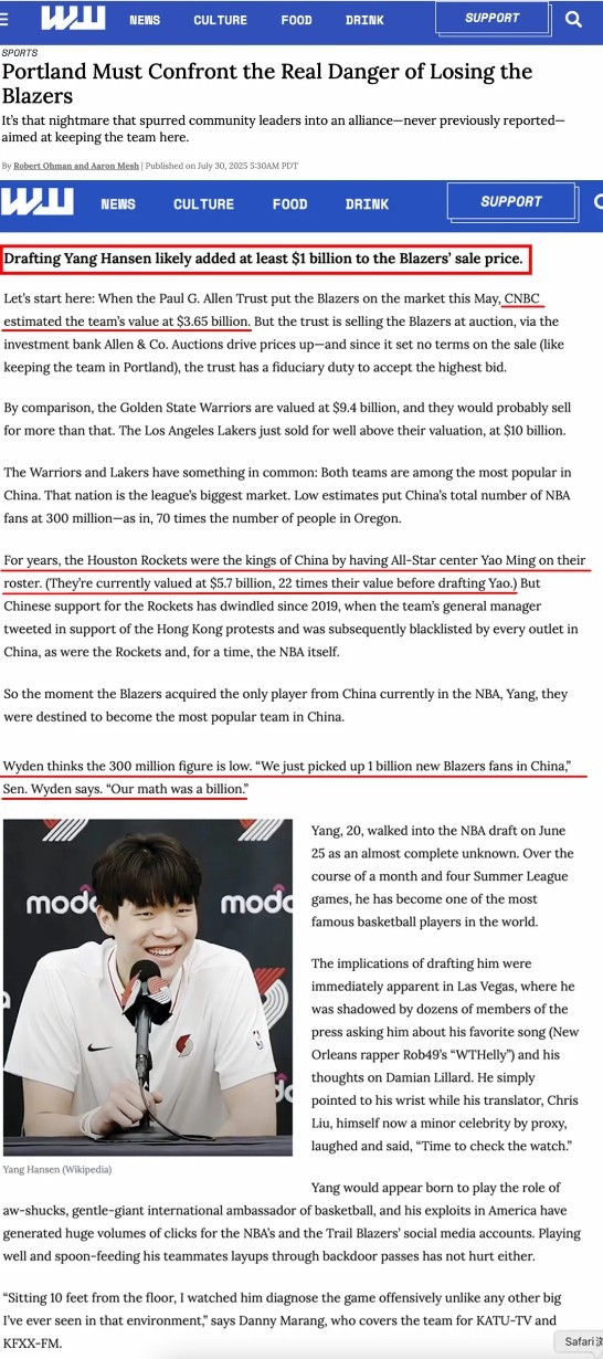 从CNBC评估到正式交易,过了大约三个月,这其中有NBA球队价格继续水涨船高的因素,但是《威拉米特周刊》的作者在文章专门用一个章节,重点介绍了杨瀚森给开拓者可能带来的增值效应。