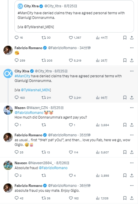 而在今天确认多纳鲁马将加盟曼城后,罗马诺本人也出现在了那条帖子的评论区,回复道:“还是照旧.....首先(球迷)都说‘他们给你钱让你说假话了!’然后又说...我爱你罗马诺,HWG!哇,看看多纳鲁马...”“就像你说的,绝对是骗人,哥们...好好享受多纳鲁马吧!”