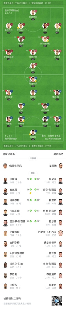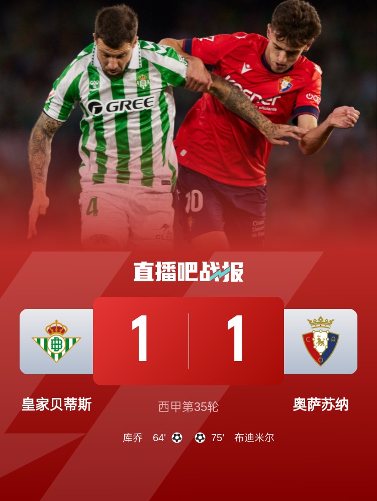 第75分钟,奥萨苏纳右路传中,中间奥罗斯蹭了一下,后点布迪米尔凌空抽射破门!奥萨苏纳1-1扳平贝蒂斯↓