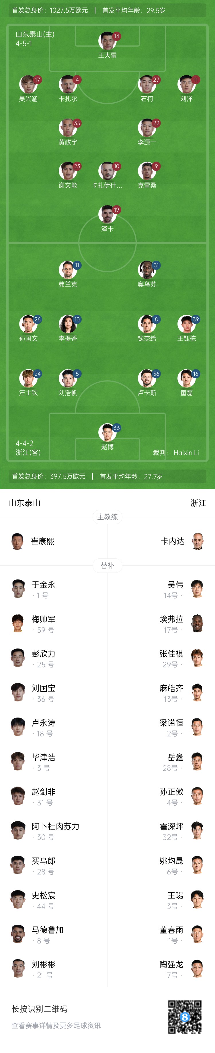 山东泰山首发:14-王大雷、4-卡扎尔(F)、11-刘洋、17-吴兴涵、27-石柯、22-李源一、23-谢文能、35-黄政宇、9-克雷桑(F)、10-卡扎伊什维利(F)、19-泽卡(F)