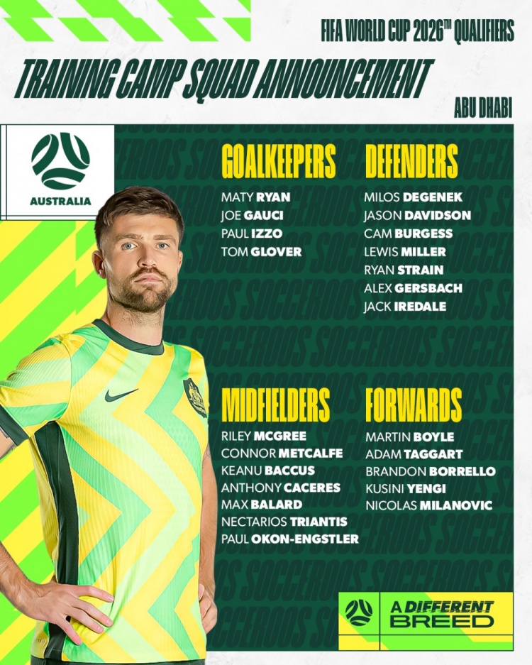 5月16日讯 今日,澳大利亚国家队官方公布了球队6月份的23人名单,他们将在6月份迎战日本队和沙特队。