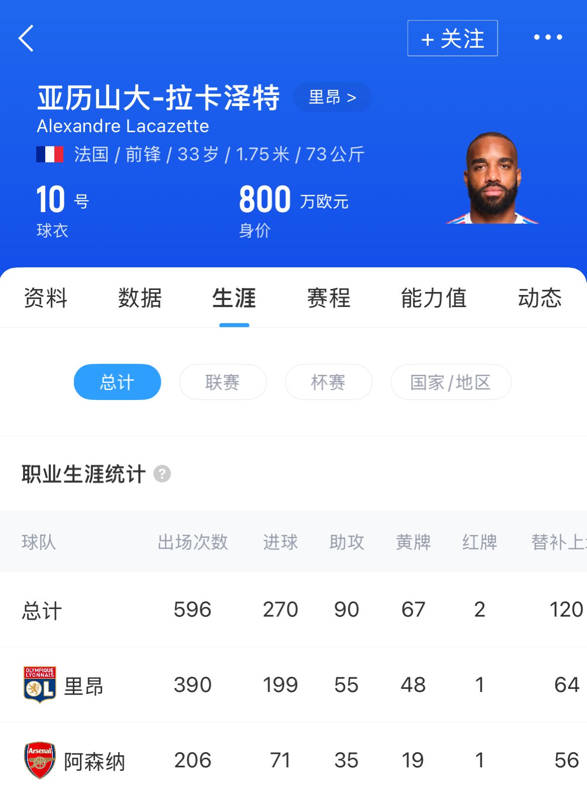 拉卡泽特将在今夏与里昂合约到期后成为自由身,目前33岁的他已经为里昂出战390场,攻入199球另有55次助攻。而在效力枪手的5年里,拉卡泽特206场交出了71球35助。