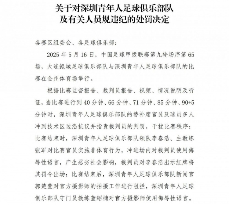5月16日中甲联赛第9轮深圳青年人客场对阵大连鲲城,比赛第40分钟、66分钟、71分钟、85分钟、90+5分钟时,深圳青年人足球俱乐部队的替补席官员及球员多人冲到技术区边沿抗议并指责裁判员的判罚,干扰比赛秩序;比赛结束时,深圳青年人足球俱乐部队领队李春浩、主教练张军对比赛官员实施非体育行为,冲进场内对裁判员使用侮辱性语言,产生恶劣社会影响,裁判员对李春浩出示红牌将其罚令出场;比赛结束后,深圳青年人足球俱乐部队新闻官郭楚萱对官方摄影师的拍摄工作进行阻拦,深圳青年人足球俱乐部队守门员教练董绍楠对官方摄影师使用侮辱性语言。