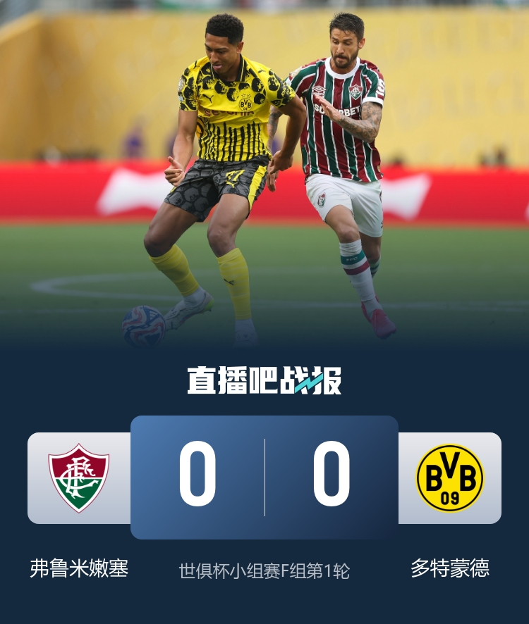 6月18日讯 北京时间6月18日凌晨0时,世俱杯小组赛F组第1轮,弗鲁米嫩塞在大都会人寿体育场对阵多特。上半场双方均无建树。弗鲁米嫩塞半场0-0战平多特。下半场,小贝林厄姆替补登场上演他在多特的首秀,科贝尔接连关键扑救力保城门不失。最终弗鲁米嫩塞0-0战平多特。