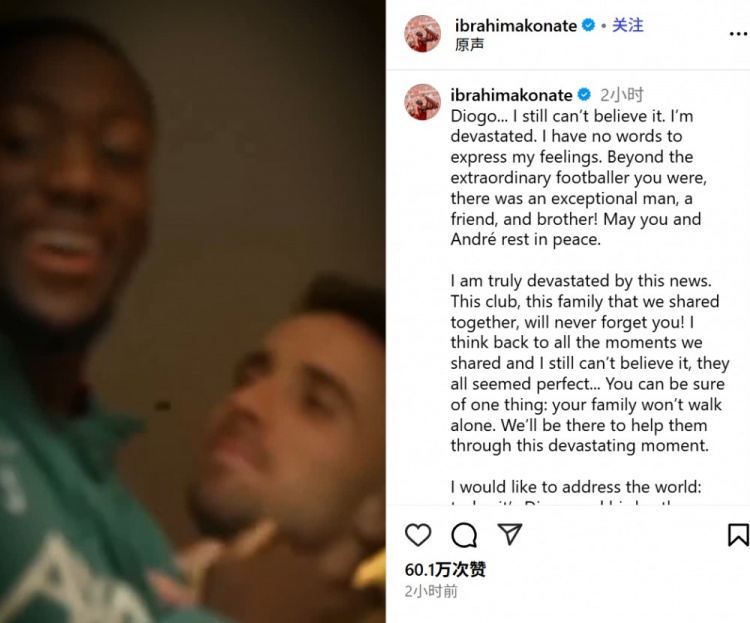 迪奥戈(若塔)……我还是没法相信。我心都碎了,真的不知道该怎么表达此刻的感受。你不仅是一位非凡的球员,更是一位难得的挚友、兄弟!愿你和安德烈安息。