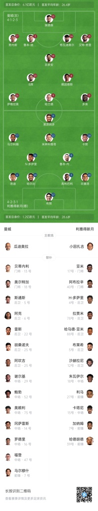 曼城替补:13-贝蒂内利、18-奥尔特加、5-斯通斯、6-阿克、7-马尔穆什、14-尼科-冈萨雷斯、16-罗德里、22-雷斯、25-阿坎吉、29-谢尔基、45-胡桑诺夫、47-福登、52-鲍勃、75-奥赖利