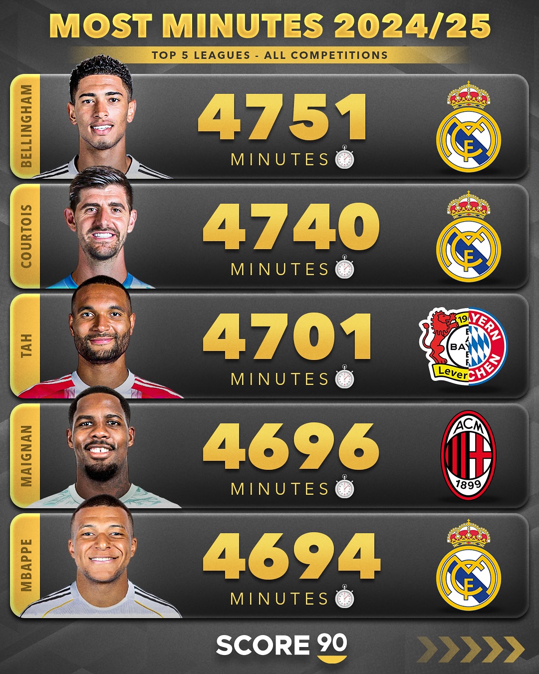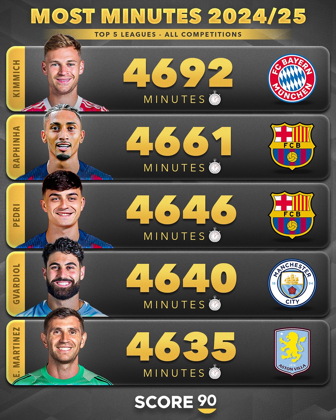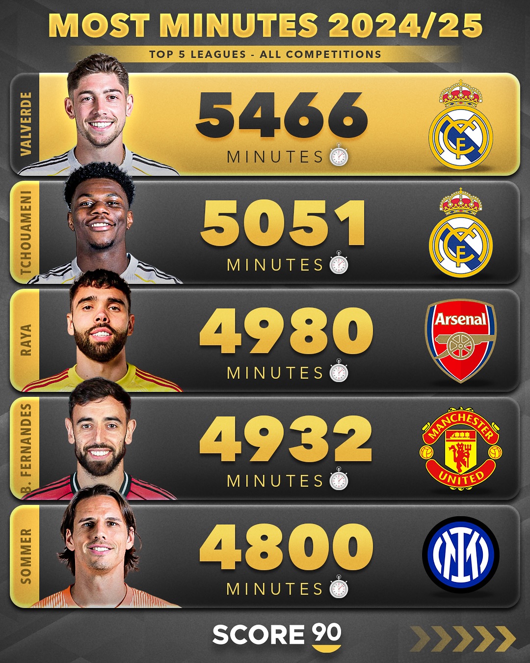 07月06日讯 外媒score90统计了本赛季至今五大联赛球员在俱乐部的出场时间,巴尔韦德以5466分钟断层排名第一,第二则是他的队友琼阿梅尼。