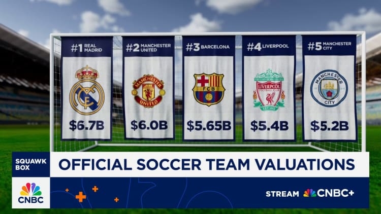05月06日讯 美国媒体CNBC公布了2025年全球足球俱乐部的估值情况,皇马、曼联、巴萨、利物浦、曼城排名前五。