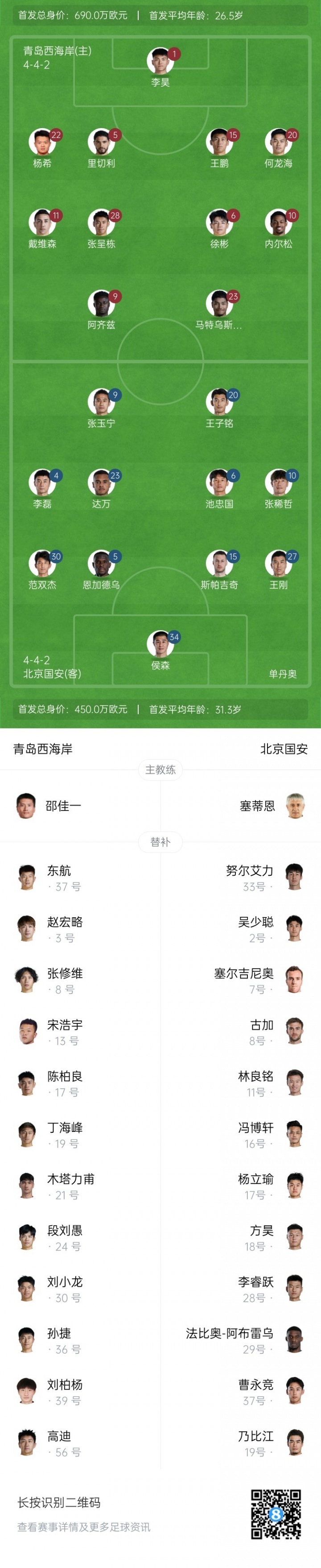 青岛西海岸首发:1-李昊、5-里切利(F)、6-徐彬、22-杨希、28-张呈栋、15-王鹏、20-何龙海、23-马特乌斯(F)、9-阿齐兹(F)、10-内尔松卢斯(F)、11-戴维森(F)
