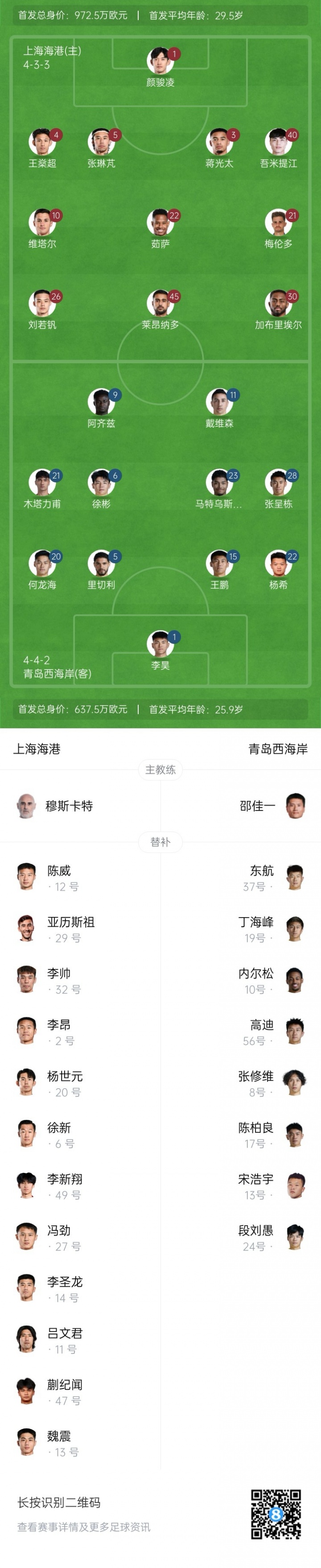 上海海港首发:1-颜骏凌、3-蒋光太、4-王燊超、5-张琳芃、40-吾米提江-玉苏普、22-马修斯-茹萨(F)、10-马特乌斯-维塔尔(F)、21-梅伦多(F)、26-刘若钒、30-加布里埃尔(F)、45-莱昂纳多(F)