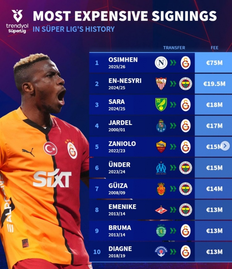 7月31日讯 奥斯梅恩转会加拉塔萨雷只待官宣,《转会市场》也统计了土耳其球队历史最贵买人榜。