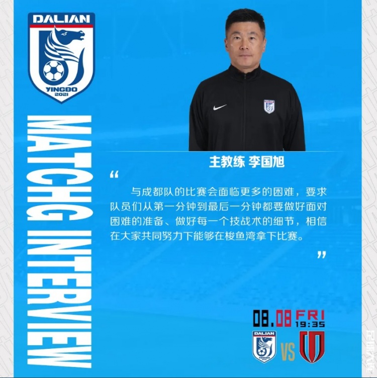 8月7日讯 明天19:35,中超第20轮,大连英博主场对阵成都蓉城,据足球大连报道,英博主帅李国旭赛前表示,球队针对蓉城会有详细的安排。