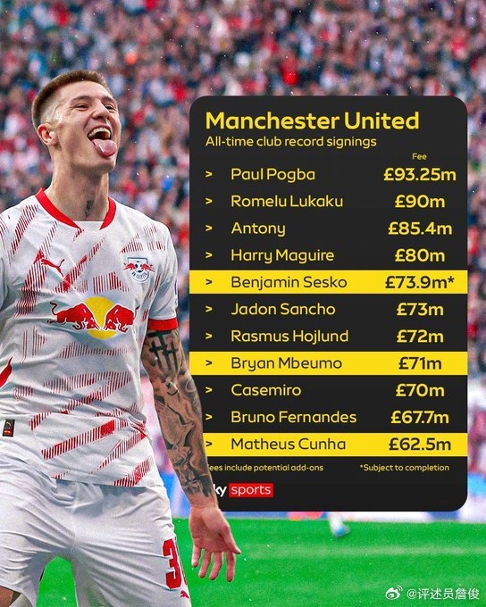 詹俊在社媒写道:曼联官宣斯洛文尼亚前锋塞斯科加盟,转会费近7400万镑,在俱乐部球员转会身价榜上排名第五。红魔新的锋线三叉戟耗资近两亿,他们在原来的俱乐部表现都相当不错:塞斯科上季有21球6助攻,姆贝莫20球8助攻,库尼亚17球6助攻。加上他们身后还有队长B费,相信任何对手的防线都将倍感吃力。