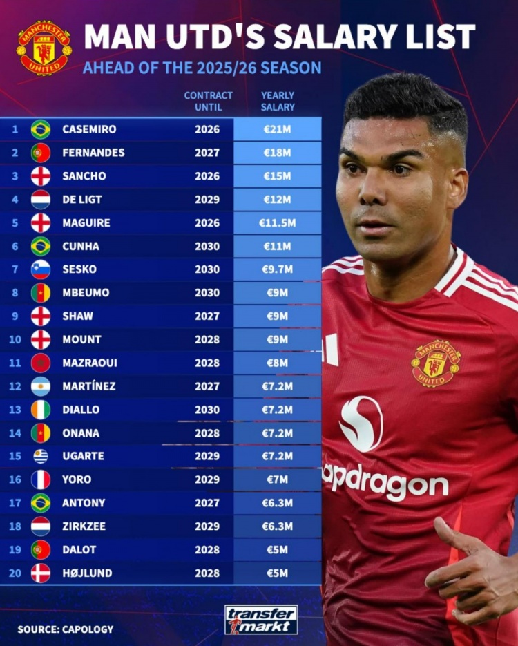 8月24日讯 德转盘点了曼联球员年薪榜单,其中卡塞米罗2100万欧居首,桑乔1500万欧第三,具体如下(合同到期时间+年薪):